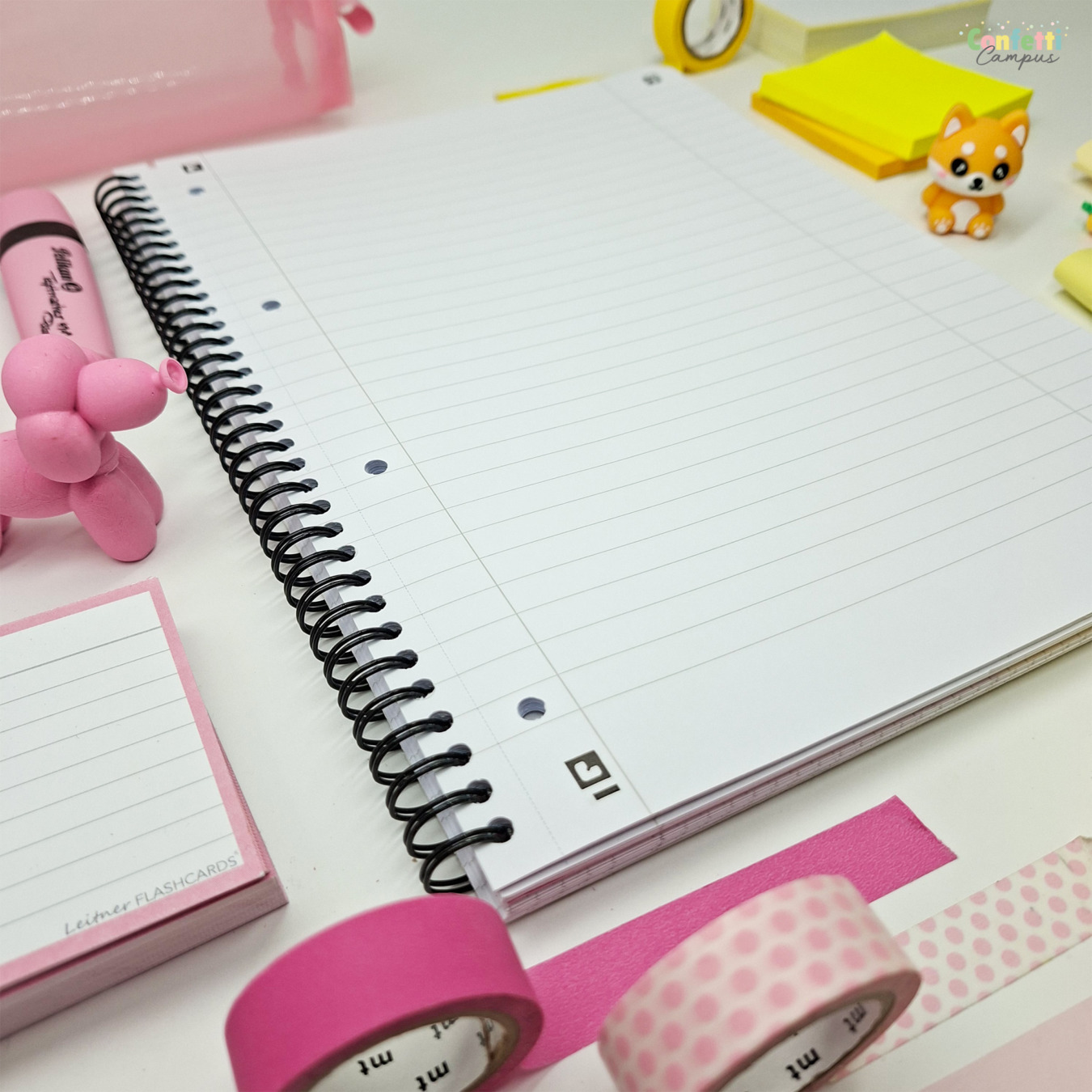 Die stabile Doppelspiralbindung (Wire-O) sorgt für ein flaches Aufschlagverhalten und hohen Schreibkomfort, auch bei intensivem Gebrauch. Dank der Mikroperforation lassen sich Seiten sauber und mühelos heraustrennen, während die 4-fach-Lochung das direkte Abheften in Ordnern ermöglicht.