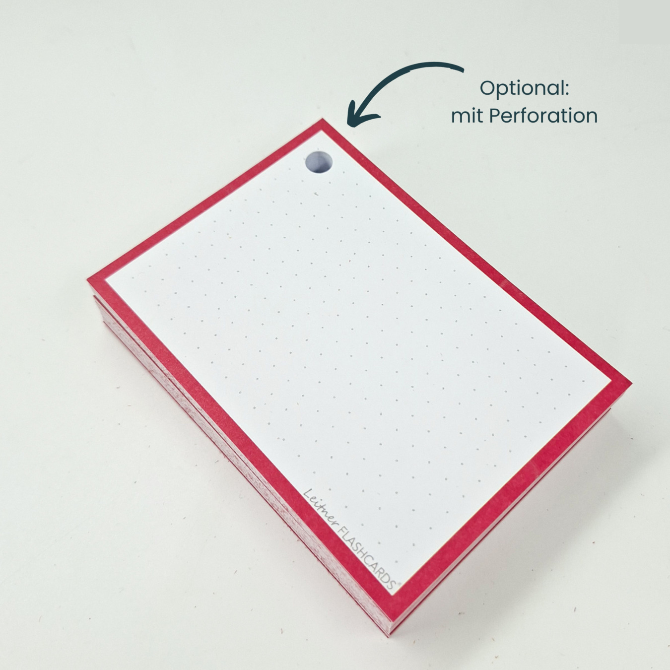 Optional: Die Flashcards können perforiert werden. Dann bohren wir ein Loch in die Karten. Mit einem Klickring dazu kannst du die Karten immer praktisch überall mit hinnehmen. Der Klickring ist aus robustem Metall gefertigt und hat einen überlappenden Verschluss. In jeden Klickring passen bis zu 100 Karten.