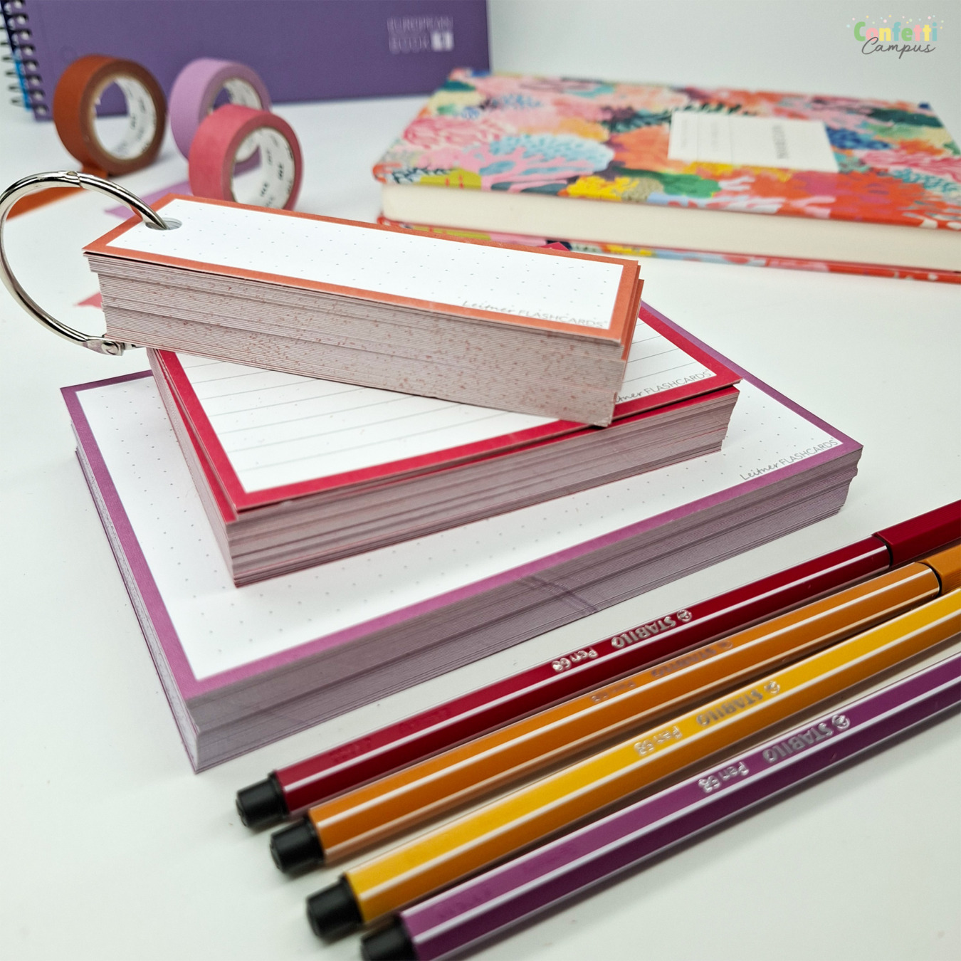 Leitner Flashcards Karteikarten sind in über 100 verschiedenen Designs, Farben und Lineaturen erhältlich. Wähle deine Lieblingsfarbe oder matche die Karten mit deinen Blöcken & Mappen.