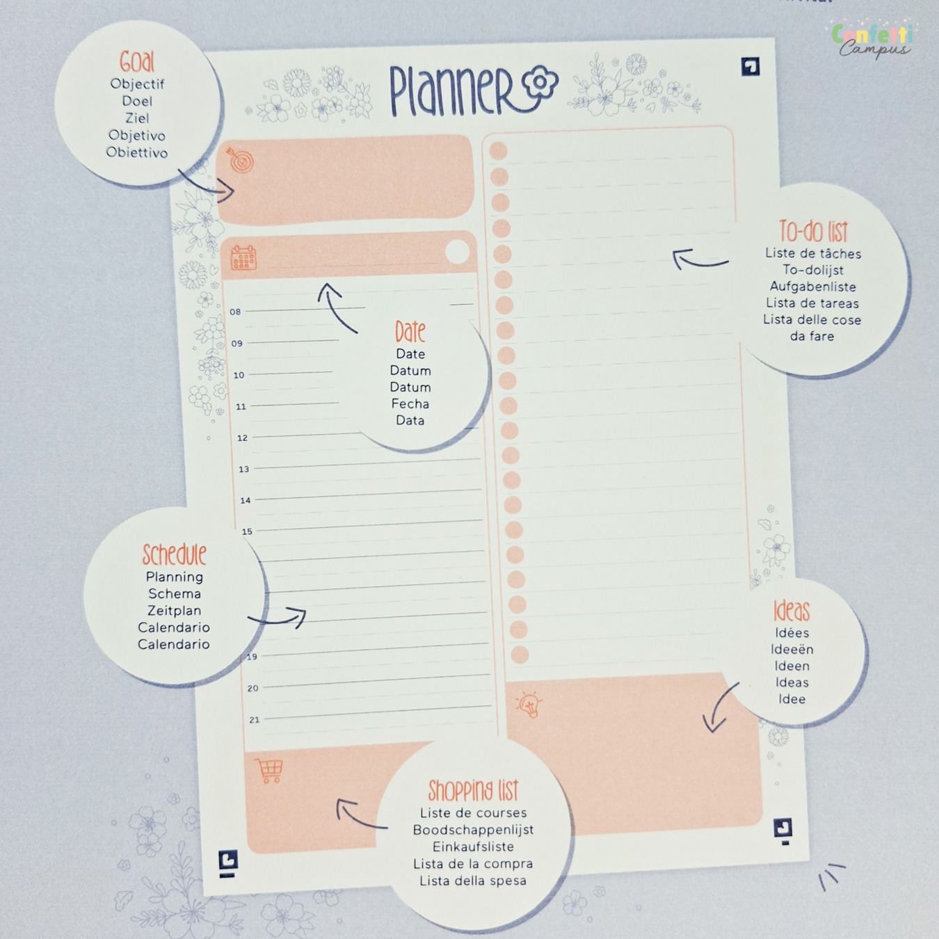 Jede Seite besteht aus zwei Spalten: eine für eine Klare Tagesplanung mit Uhrzeiten, die zweite für Listen wie Einkaufslisten, To Do's oder mehr.